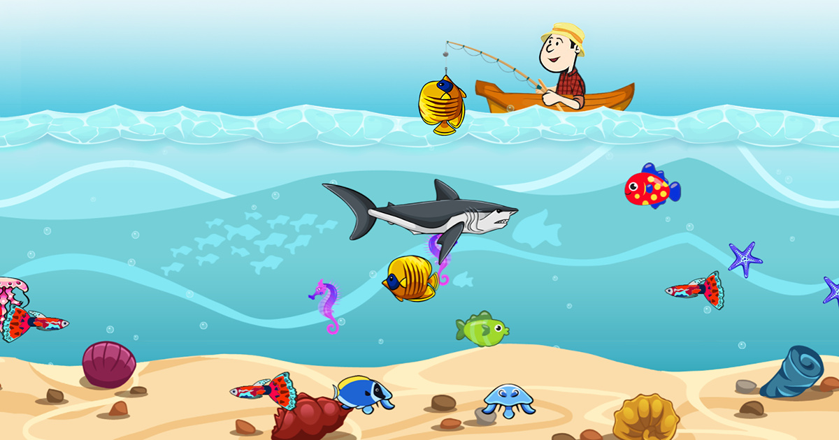 Fish season has opened and there is a lot of fish in the sea. The fisherman is a bit of a novice and his boat is also slow moving. Do you want to help him? Move the boat with the right and left arrow keys. Throw the fishing rod into the sea with the down arrow key. When you see sharks, drop bombs on them. Use the time well and complete the levels.